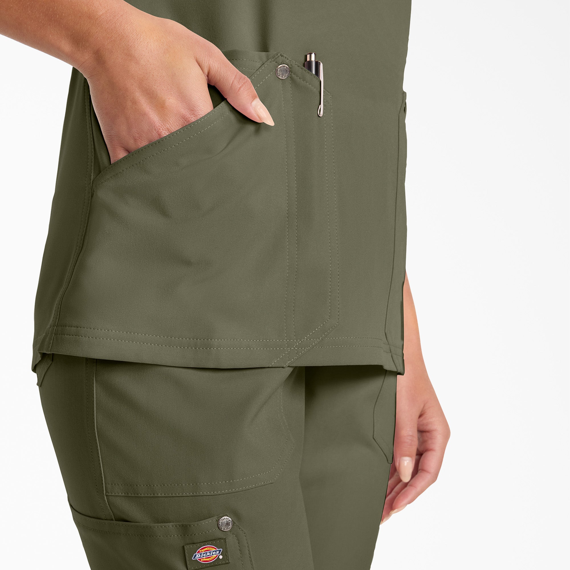 The details don’t disappoint on this Contemporary fit V-neck top. There is decorative stitching on the neckband plus decorative topstitching on all seams for added style. Four pockets create organized storage with double patch pockets on each side (right features a pen/instrument slot). Decorative logo snaps at pocket corners. A back yoke completes the look.